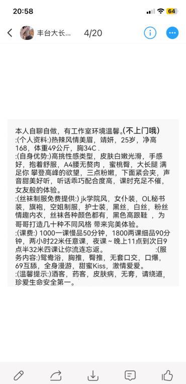 丰台区婧妍,果然名不虚传,怪不得那么多人找,极品妖精,体重不过百,骨子里散发出一种风骚气息,让人上头不已,性价比还可以,也算比较高端,胸很大奶头却又小又粉粉的,服务热情周到,其他的兄弟们自己体验。